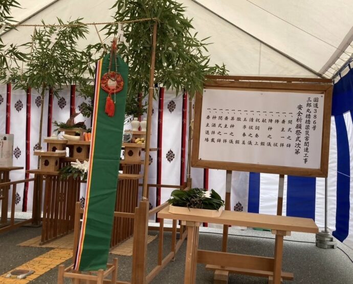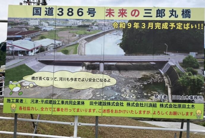 三郎丸橋の復旧に向けて❢❢ 2025/08/27 「国道386号三郎丸橋橋梁災害関連工事安全祈願祭」が開催されました。昨年7月に被災して通行止めになっている三郎丸橋。いよいよ本格的な架け替え工事が始まるのを前にしての神事です。 総事業費はおよそ20億円で、工事は橋を支える橋脚や橋台といった下部と人や車が通行する橋げたに分けて発注されます。 令和9年3月完成予定ですが、1ヶ月でも、1週間でも早く開通することを目指します❗️