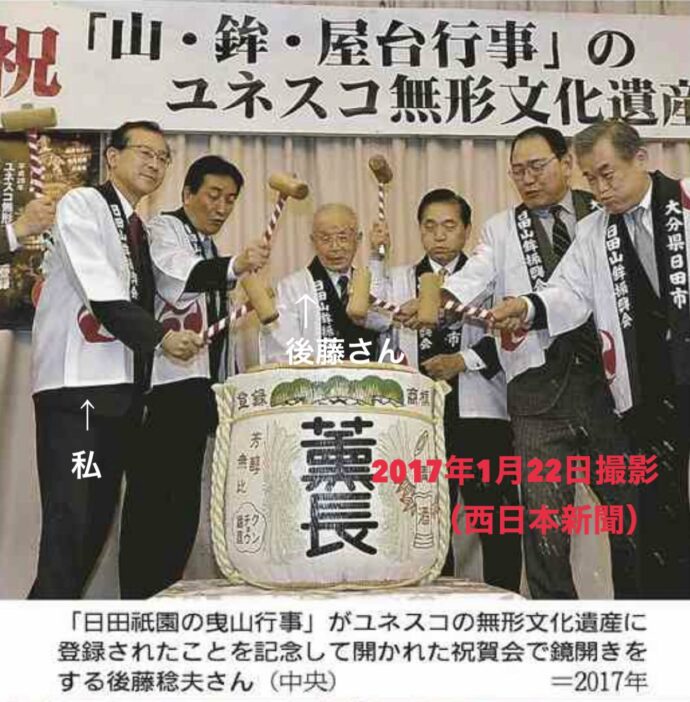70才から99才まで会長を務められ、日田祇園の振興に力を尽くしていただきました。私にとっては大原八幡宮氏子総代の先輩でもあり、いろいろな面でご指導いただきました。後藤稔夫さんのご功績に感謝申し上げるとともに、心からご冥福をお祈りします。