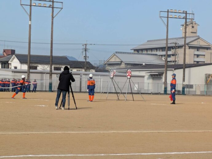 ↑ 三隈川での見事な放水訓練 ↓ 大原グランドでの操法訓練の披露