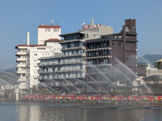 「日田市消防団出初式」が好天に恵まれて、盛大に開催されました。今年も多くの市民の皆さんが見守る中、大原グランドでの整然とした点検・訓練・行進、三隈川での一糸乱れぬ放水などを披露しました。
