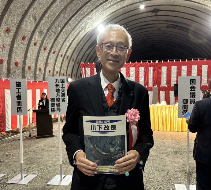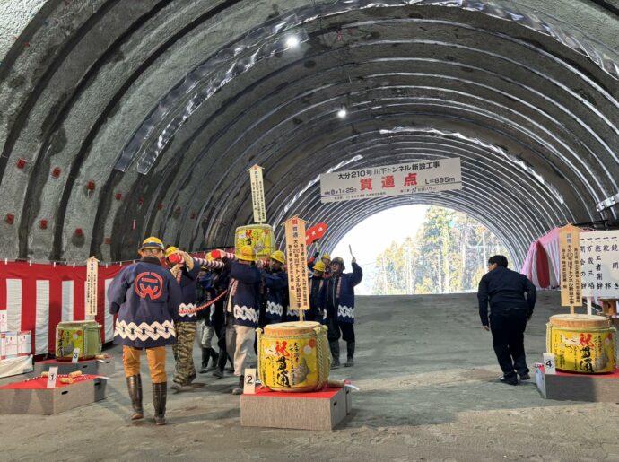 国道210号の「加々鶴(かかづる)トンネル」(日田市高井町)のバイパストンネルである「仮称・川下(かわした)トンネル」の貫通式が開催されました。